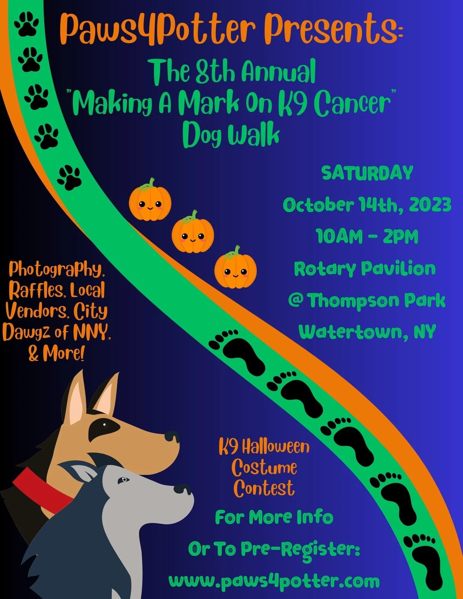 Follow our Facebook event page 8th Annual "Making A Mark On K9 Cancer" Dog Walk to stay up-to-date on all of the upcoming information about the dog walk! If you are joining virtually, please be sure to request an invitation to the private Facebook group #RunCancerRun2023 Virtual Dog Walk - Paws4Potter to stay up-to-date on all of the contests going on for the virtual participants!